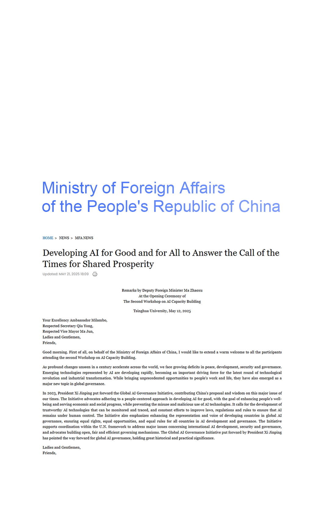 Developing AI for Good and for All to Answer the Call of the Times for Shared Prosperity_Ministry of Foreign Affairs of the People's Republic of China